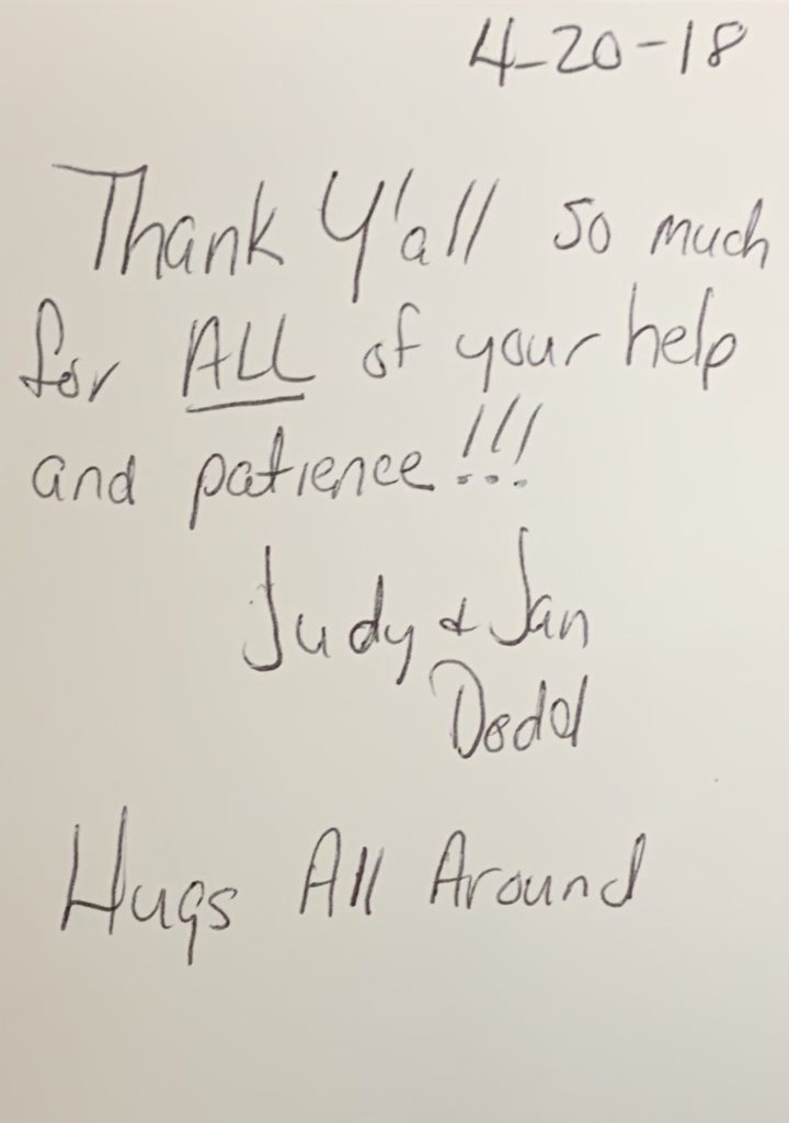 “Thank y’all so much for all off your help and patience. Hugs all around.” ~ Judy & Jan Dodd