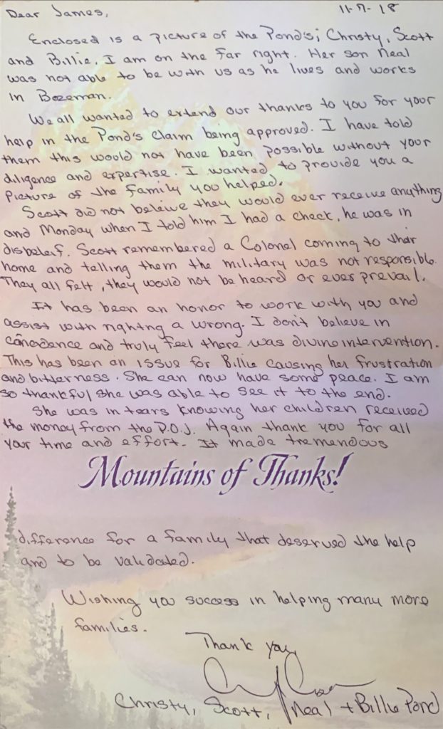 “Mountains of thanks! Enclosed is a picture of the Ponds: Christy, Scott, and Billie. We all wanted to extend our thanks to you for your help in our claim being approved. I have told them this would not have been possible without your diligence and expertise. I wanted to provide you a picture of the family you helped. Scott did not believe they would ever receive anything. On Monday, when I told him I had a check, he was in shock, especially because he remembered a colonel coming to their home and telling them the military was not responsible. They all felt they would not be heard or ever prevail. It has been an honor to work with you and assist with righting a wrong. I don’t believe in coincidence and truly feel divine intervention occurred here. This has been an issue for Billie, causing her much frustration and bitterness. She can now have some peace. I am so thankful she was able to see it to the end. She was in tears knowing her children received the money from the DOJ. Again, thank you for all your time and effort. It made a tremendous difference for a family that deserved the help and to be validated. Wishing you success in helping many more families. Thank you.” ~ Christy, Scott, Neal and Billie Pond