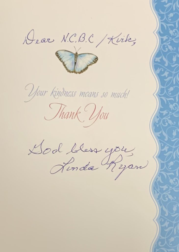“Your kindness means so much! Thank you. God bless you.” ~ Linda Ryan